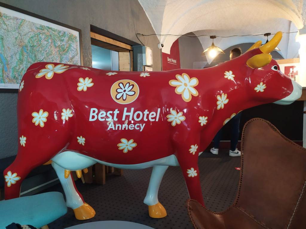 I hadn’t noticed it before when we arrived but downstairs in the lobby, there’s a statue of a red cow.
