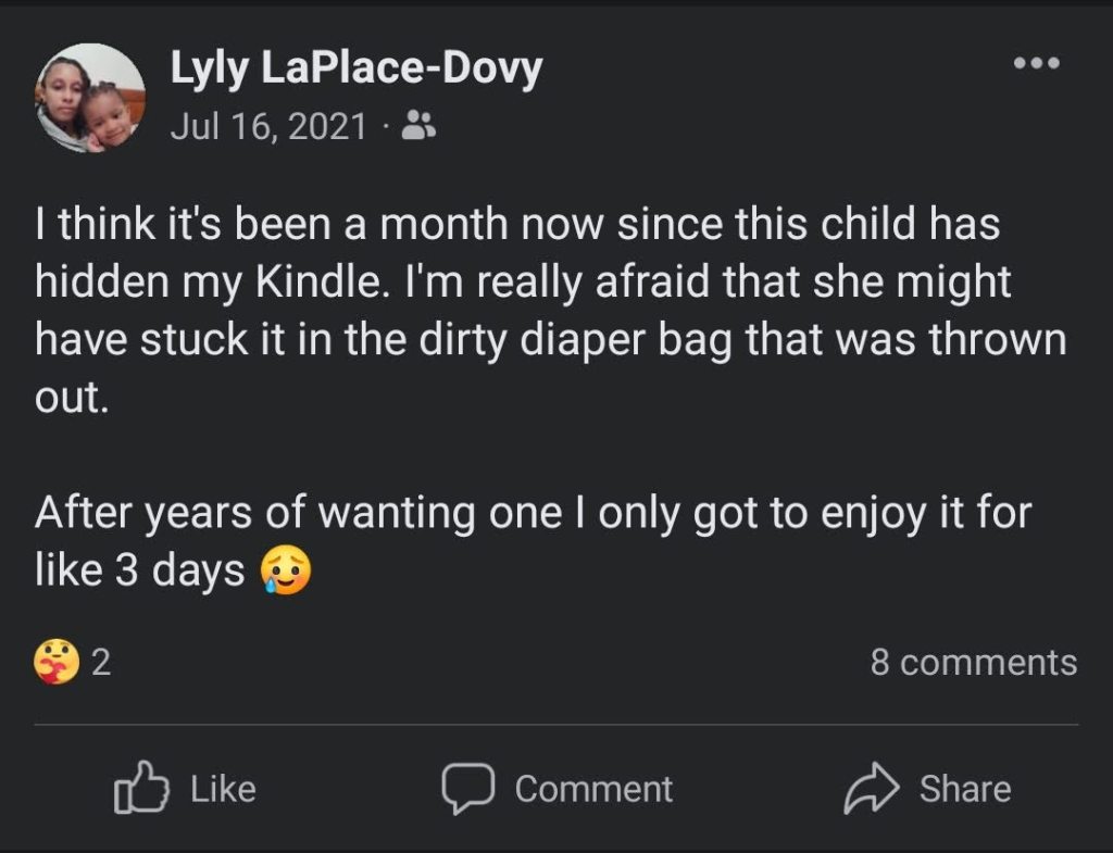 When they say you find something when you least expect it they are not lying, I was going through some of my daughter’s old clothes to see what to get rid off and there my Kindle was in the bag, I don’t even remember this bag of clothes being in the bedroom where she could reach.