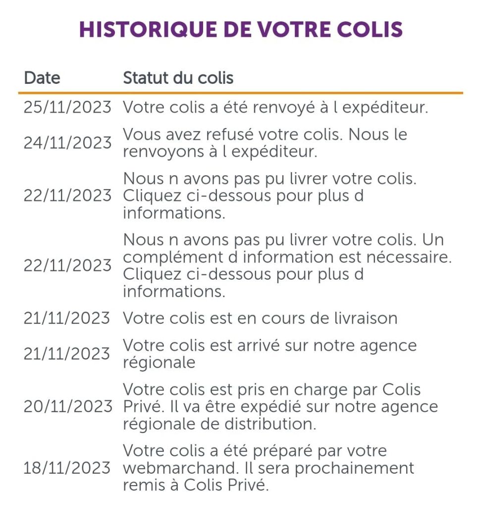 Le 17 novembre, j’ai reçu l’e-mail “You’re In”. Le 20 novembre, j’ai reçu un e-mail de Colis Privé m’informant qu’ils avaient un colis pour moi et qu’il serait livré dans les prochains jours. Le 21, j’ai reçu un SMS m’indiquant qu’ils ne pouvaient pas livrer le colis et qu’ils avaient besoin d’un code d’accès. Il n’y a pas de portail devant ou à côté de ma maison, je ne vois donc pas pourquoi ils en auraient besoin. Je suis allé sur le site, et il n’y avait aucun moyen de reprogrammer la livraison, juste d’ouvrir une réclamation, ce que j’ai fait. Je n’ai reçu aucun autre courriel ou message texte, et le 24, j’ai reçu le message indiquant que le colis avait été renvoyé à l’expéditeur.