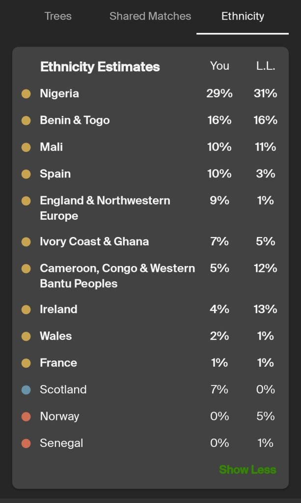Here is my Half first cousin, their parent is my mother’s half sibling. We share 7% of our DNA, 485 cM across 22 segments. My cousin and our aunt who is my full aunt share 1031 cM across 34 segments while I share 1808 cM across 60 segments. My cousin actually share a little more DNA with my brother than I do and I don’t like it lol, my brother actually shares 594 cM across 20 segments, it doesn’t really change the fact that this is our cousin but in my mind it’s like they are more his cousin than mine and it makes me a little sad. It’s an illogical thought but my mind travels down these paths frequently.