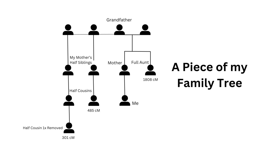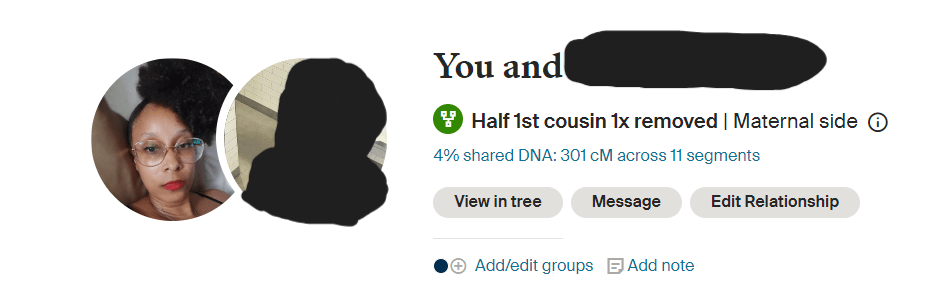 Now, here is my half 1st cousin once removed, we share 4% of our DNA, 301 cM across 11 segments, their shared DNA with my aunt is intereting, 223 cM across 10 segments, I share more DNA with them than they share with my aunt, I wonder if it means that my mother shares more DNA in common with this half sibling or maybe their other parent is somehow related to me through my father. This cousin’s parent is my half 1st cousin which means their grandparent is my mother’s half sibling.