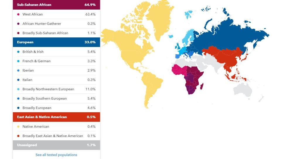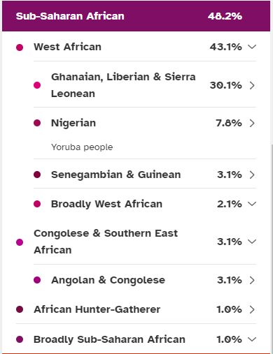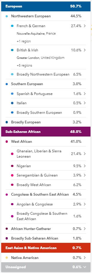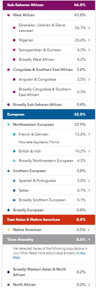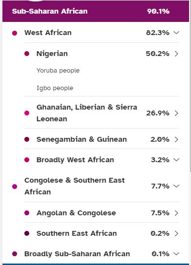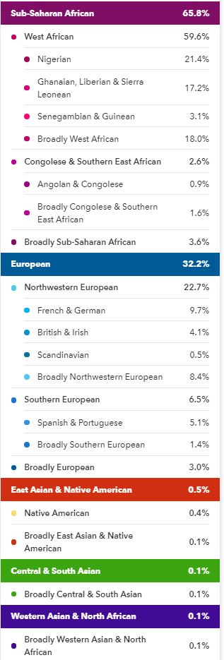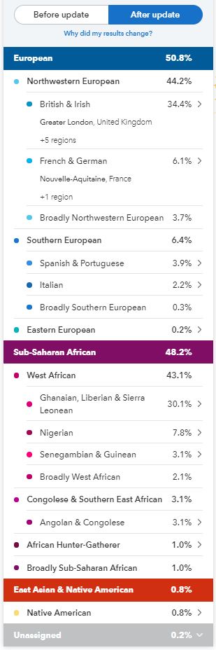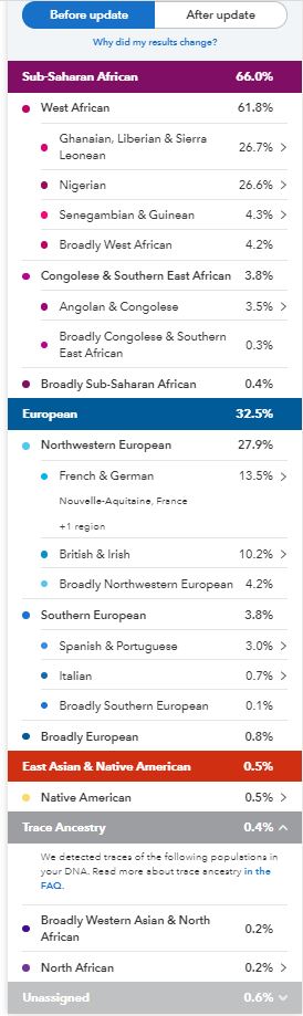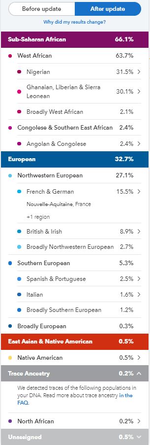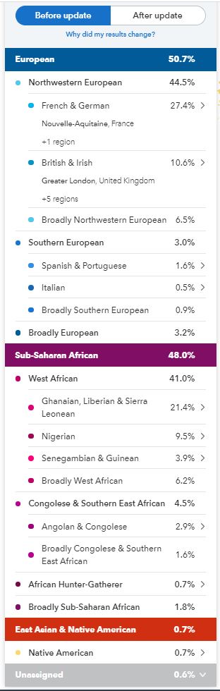 In May 2019 my results went through another update, they called this a Beta update, my African portion was broken down, even more, I lost the Sudanese but gained Ghanaian, Liberian & Sierra Leonean, the Congolese & Southern East African got a break down showing Angolan & Congolese but there were still those pesky Broadly categories.