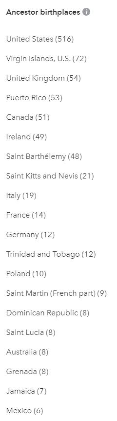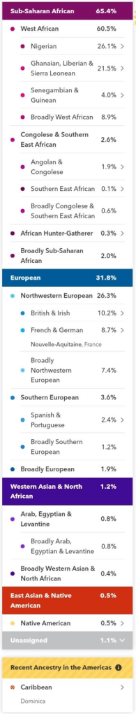 My European stayed mostly the same. Scandinavian at .4% was added send it made sense since my brother had Norway and Sweden which I assumed came from my Father’s mother. My grandmother’s family has been in the Danish West Indies since the first slaves were brought there. There’s also a mulatto ancestor with the surname Boldt, I admit it’s not much evidence but a cousin who descended from that same line also has Norway and Sweden. Unfortunately, Ancestry DNA doesn’t have a Chromosome browser so I can’t see where that Norway and Sweden are located and if my brother and this cousin match on that same chromosome. Since doing my research on my grandfather’s place of birth Saint-Barthélemy, I realized that Swedish could come from that side since the Swedish colonized the Island from 1784 to 1877.