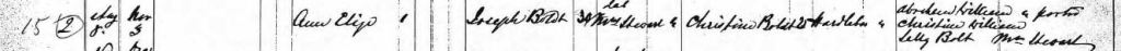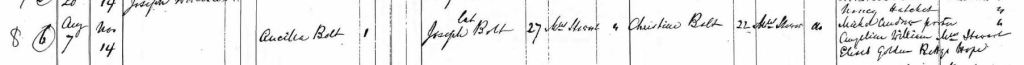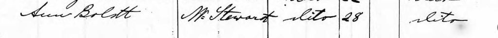 Unfortunately, Maud’s father is unknown and the baptism record provides no clues. Ann was born on August 8, 1872, the daughter of Joseph “Joe” Boldt born about 1842, and Christina Chamberlin born about 1846 (Baptism record below)