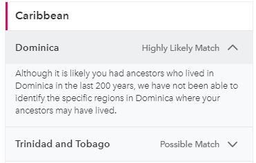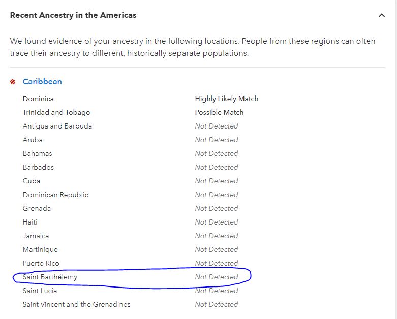 Speaking of Dansk Vestindien, I’m kind of surprised that 23andme still doesn’t have an option for there in the Recent Ancestors in the Americas category. They didn’t have Saint-Barthélemy before but I spoke about it on the forums and they added it. My father and I don’t have that but I have Dominica and Trinidad and Tobago. My father has no regions for the Caribbean at all and I find that weird because you’re suppose to have at least 5 DNA relatives with all 4 grandparents from that area to get the region but he has more than 5 for Saint-Barthélemy and he doesn’t have the region. What gives 23?