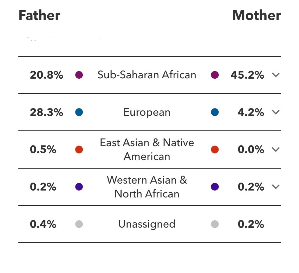 Interestingly enough, one of my aunts did 23andMe and her results came in just as they released the new groups. She is my maternal aunt and received two groups. Igbo and Yoruba. She’s also mostly African with a small bit of European which further cements the idea that we had Indigenous DNA from my maternal grandmother a tall tale. All my life I’ve been told we had Kalinago ancestry and the fact that there are Kalingao people in Dominica made it seem not unlikely, why would my mother, grandmother lie about such a thing, when I showed my results after phasing with my father my mother told me that one of my aunts said it wasn’t Kalinago but some other Asian, this can’t be true either since it would have shown up in my results, my aunts results, or even my mother and aunt’s first cousin. Both my aunt and their full first cousin show no trace of Indigenous or Asian DNA. So what’s the truth? The truth is more than likely a biracial child they tried to pass off as Asian.