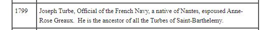 Luckily for me, it was the correct couple and that lead me to a distant cousin who had all kinds of information on my grandfather’s mother’s family. This was the first time I’d learned that her name wasn’t Josephine but Marie Josephine. The tree of this cousin took me all the way to Joseph Simon Turbé my 5x great grandfather. I assumed he was born in St. Barts as well since everyone else seemed to have been also, another rookie mistake. I did another google search which leads me to Anne Marie Danet’s post on her blog 3 – First French in the Antilles, you can see on line 24 there is a Joseph Turbe who married Anne Rose Greaux and he is the ancestor of all Turbe on the Island. This Joseph is my great grandfather. This suggested that he was from Nantes but he wasn’t born there which was a brick wall I had for a long time.