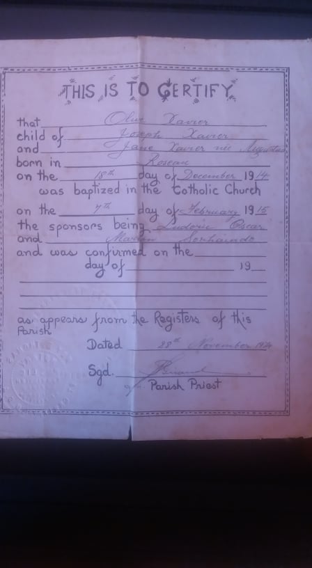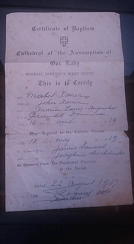 In order of age, we have the baptism record of Olive Xavier, child of Joseph Xavier and Jane Xavier née Augustus born in Roseau on the 18th day of December 1914. She was baptized in the Catholic Church on the 7th day of February 1915. The other names are really hard for me to make out but it looks like her sponsors were Ludovic Oscar and Marian S…?