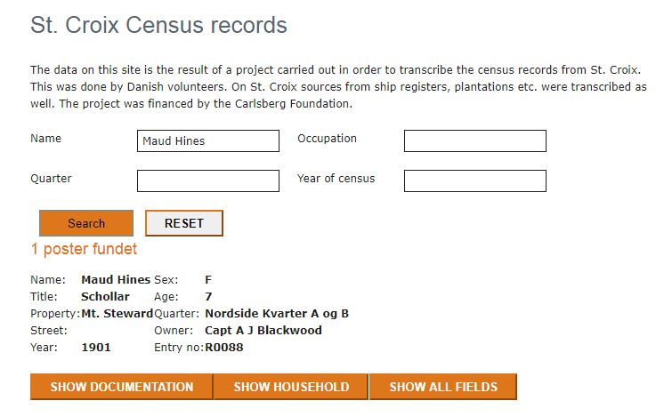 For census records, during Danish time you can find those on Ancestry which of course requires a subscription to use but you can also find the St. Croix census on the Dansk Demografisk Database by Rigsarkivet (Danish National Archives), all you do is enter a name and it will bring you up all instances of that name appearing in the Census records.