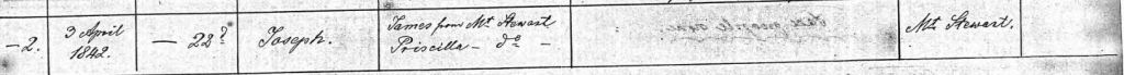 Joseph was born on April 3, 1842, parents are James and Priscilla from Mt. Stewart.