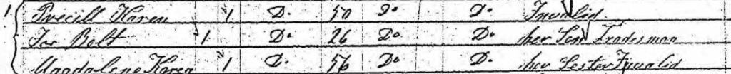 Going back to Joseph’s parents in the 1870 Census Priscilla shows up as Precill Karen. She’s an Invalid living with her son Joe and sister Magdalene Karen who is also invalid.